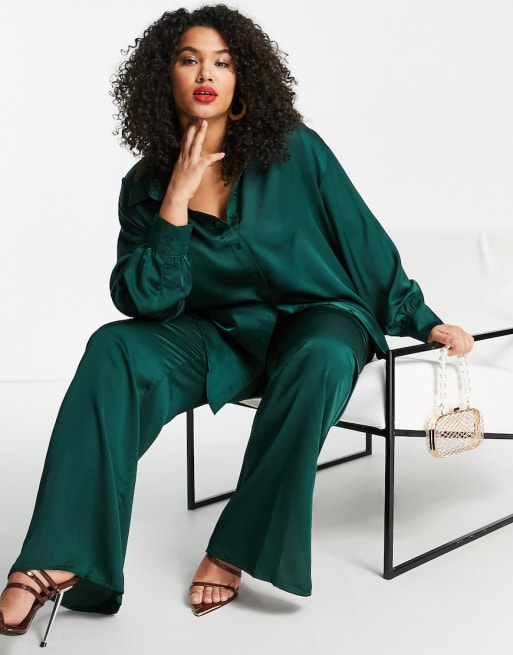 Missguided Plus - Coordinato in raso verde scuro con camicia e pantaloni a fondo ampio