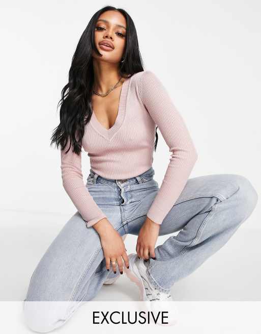 Missguided - Body aderente in maglia rosa a coste con scollo a V