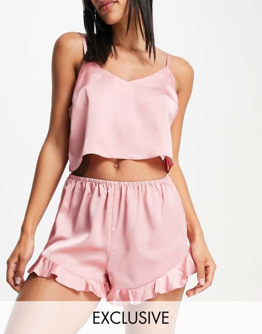 Missguided - Pigiama con canottiera e pantaloncini con volant in raso rosa