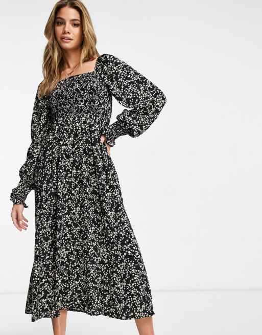 Missguided - Vestito midi a maniche lunghe con corpino arricciato nero a fiorellini