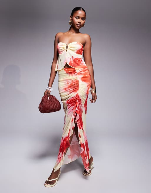 Missyempire - Gonna lunga in rete con arricciatura laterale, spacco e volant gialla e rosa a fiori in coordinato