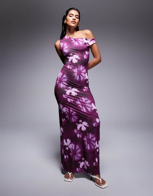 Missyempire - Vestito lungo aderente modellante in tessuto doppio con spalle scoperte viola a fiori sfumati