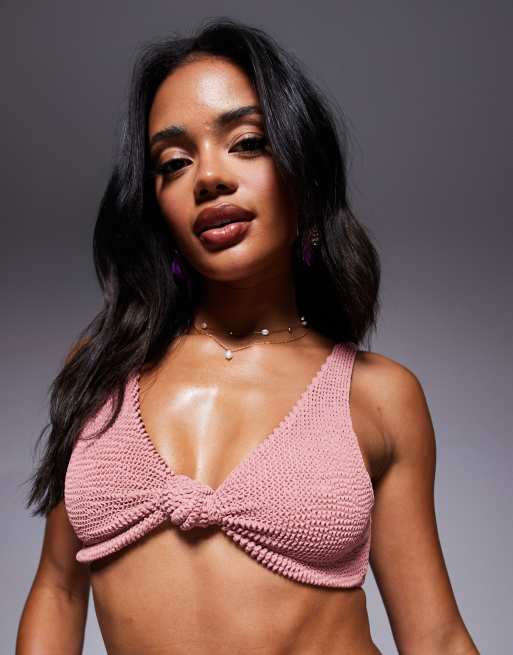 Moda Minx - Top bikini con nodo sul davanti effetto stropicciato rosa argilla