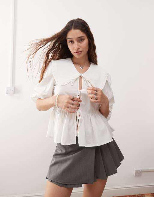 Monki - Blusa a maniche lunghe bianca con colletto con volant e peplo
