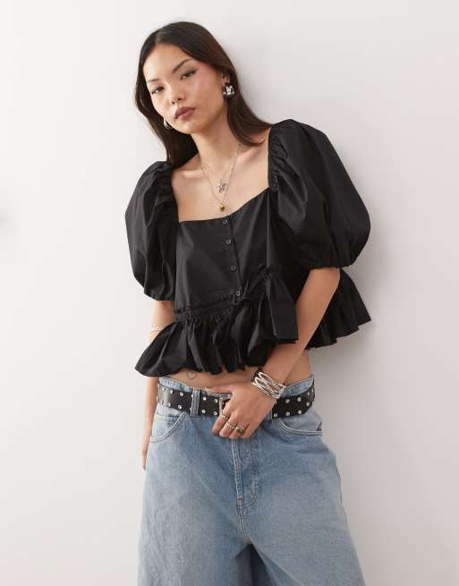 Monki - Blusa a peplo stile milkmaid con maniche a sbuffo nera