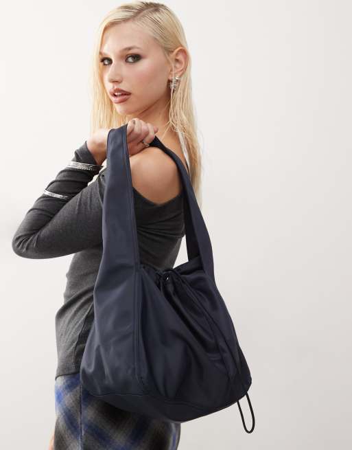 Monki - Borsa da spalla in nylon blu navy con fermacorda
