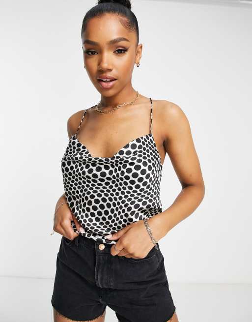 Monki - Canottiera in raso bianco e nero a pois con scollo ad anello