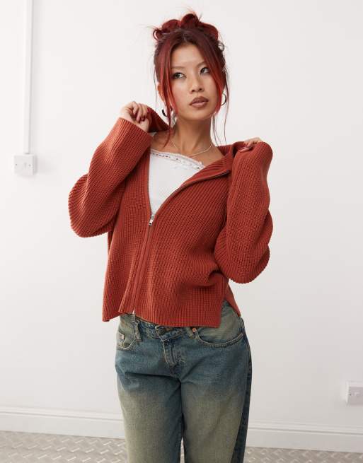 Monki - Cardigan in maglia a coste rosso ruggine con cappuccio e zip