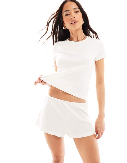 Monki - Coordinato da casa bianco traforato con pantaloncini e maglietta ristretta
