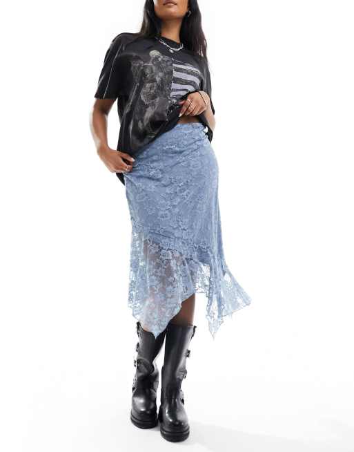 Monki - Gonna midi al ginocchio in pizzo blu navy foderato con orlo asimmetrico
