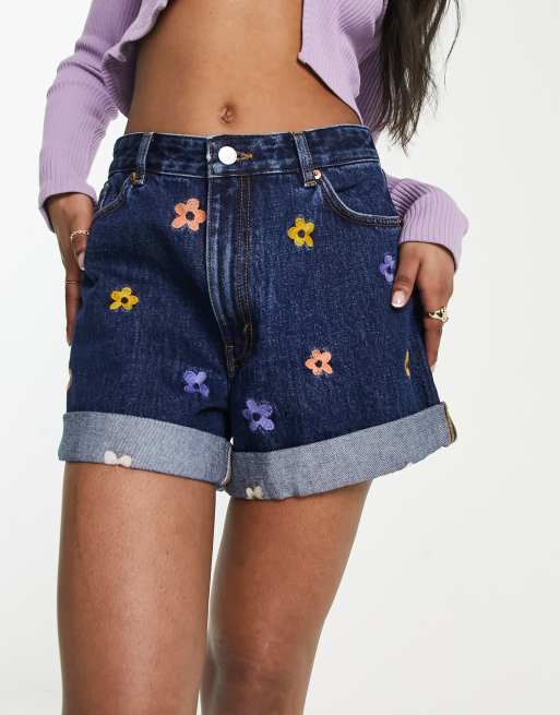 Monki - Pantaloncini in denim blu risvoltati a fiori ricamati