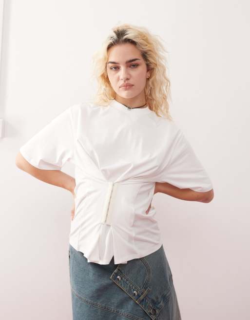 Monki - T-shirt oversize bianca con vita a corsetto