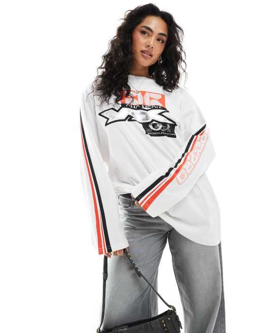 Monki - Top a maniche lunghe oversize bianco con stampa motocross