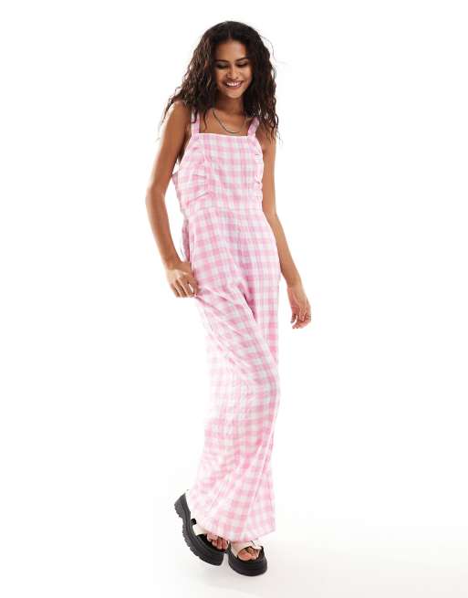 Monki - Tuta jumpsuit a quadretti rosa con collo squadrato e arricciature sul davanti
