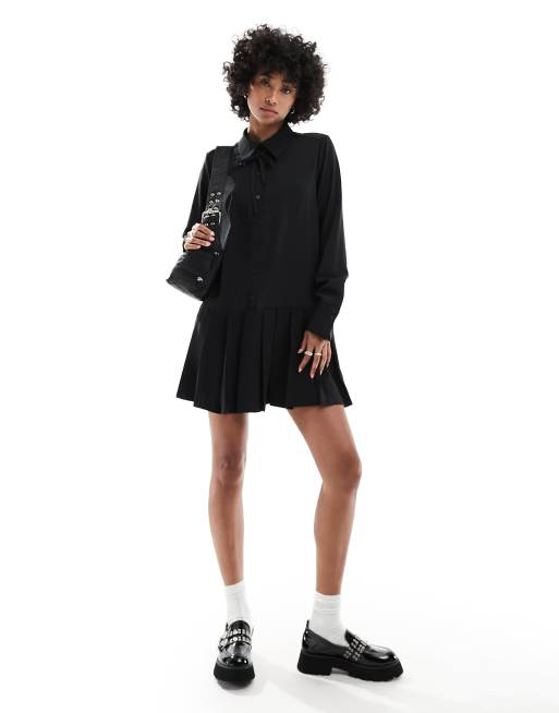 Monki - Vestito corto a maniche lunghe con colletto nero a pieghe con fiocco