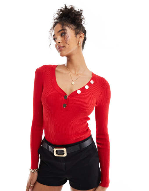 Morgan - Top a maniche lunghe in maglia a coste rosso con bottoni