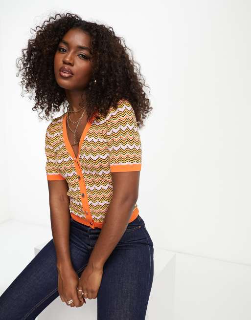 Morgan - Top in maglia arancione con bottoni e motivo a spina di pesce