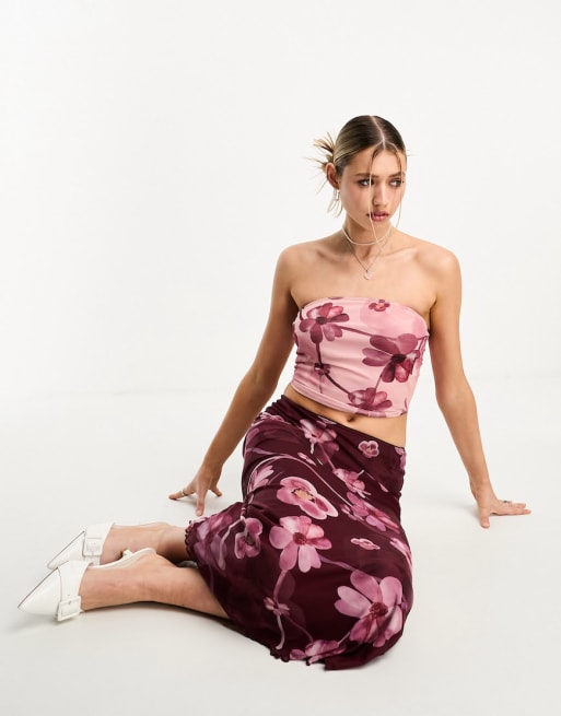 Motel - Coordinato a fiori effetto acquerello con top a fascia e gonna al polpaccio
