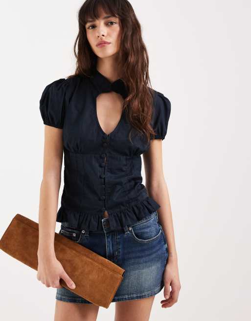 Motel - Yamila - Blusa blu navy con apertura a goccia e maniche a sbuffo