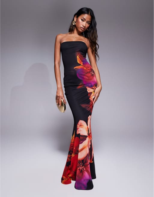Esclusiva Murci - Vestito lungo a fascia con fondo a sirena in rete nero a fiori rossi