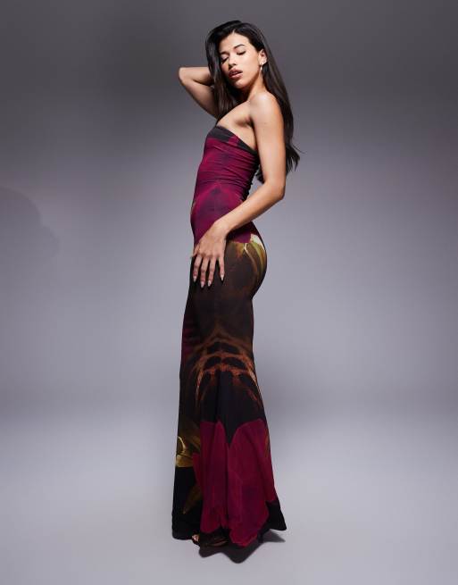 Esclusiva Murci - Vestito lungo a fascia con fondo a sirena in rete viola a fiori