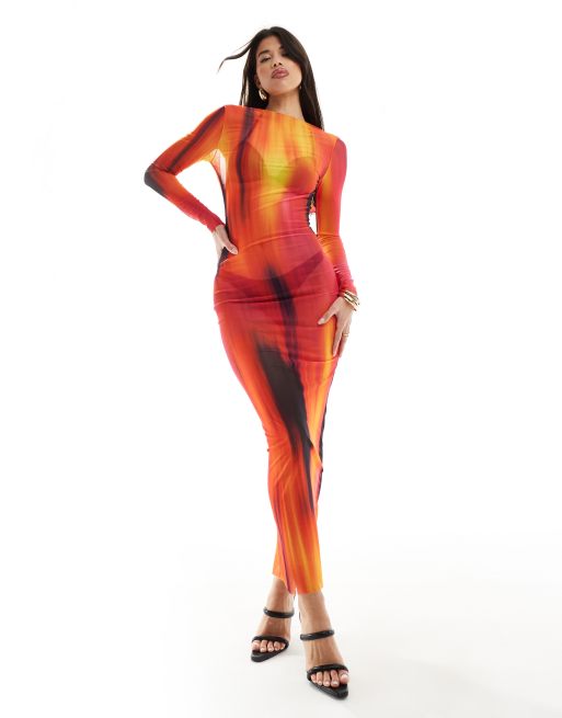 Esclusiva Murci - Vestito lungo a maniche lunghe in rete rossa con stampa astratta