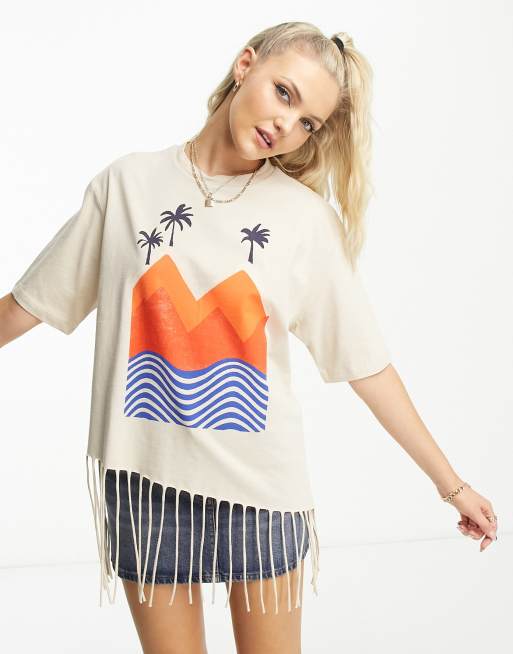 Native Youth - T-shirt écru con bordi grezzi e stampa a tema spiaggia