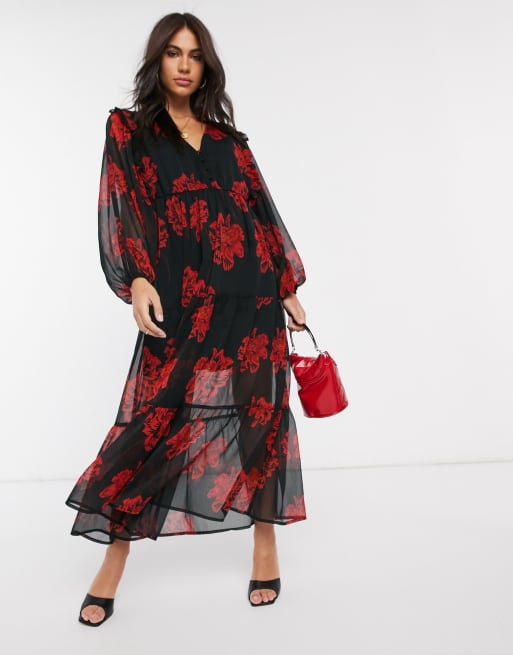 Neon Rose - Vestito da giorno lungo a strati a fiori vivaci con maniche a palloncino