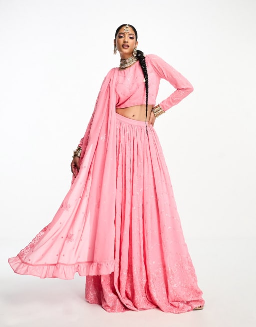 Nesavaali - Lehenga - Crop top a maniche lunghe, gonna lunga e sciarpa dupatta con ricami in coordinato
