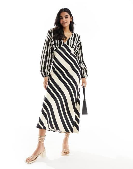 Never Fully Dressed - Vestito lungo a righe monocromatiche con maniche a palloncino all'uncinetto