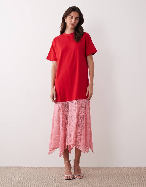 Never Fully Dressed - Vestito lungo oversize in jersey con gonna in pizzo rosso e rosa