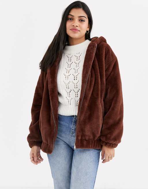 New Look - Bomber marrone scuro con cappuccio e pelliccia
