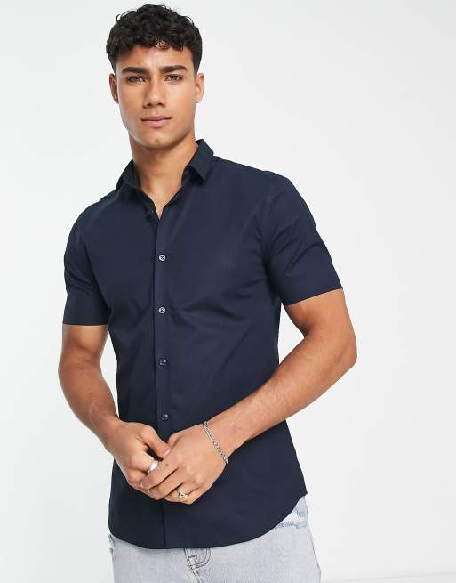 New Look - Camicia a maniche corte, attillata, in popeline blu navy