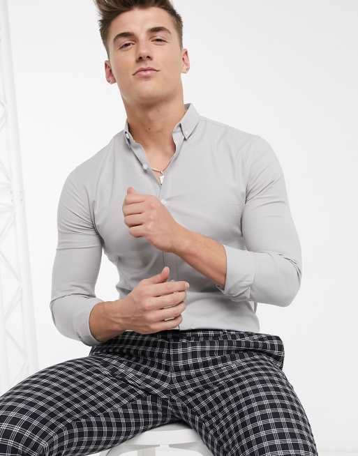 New Look - Camicia Oxford a maniche lunghe attillata grigia