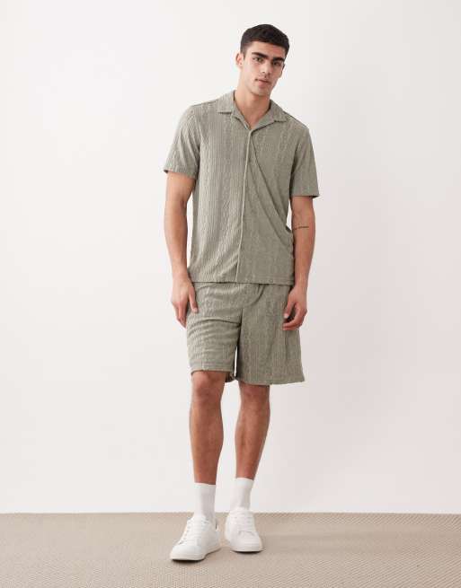New Look - Coordinato kaki chiaro con camicia jacquard e pantaloncini