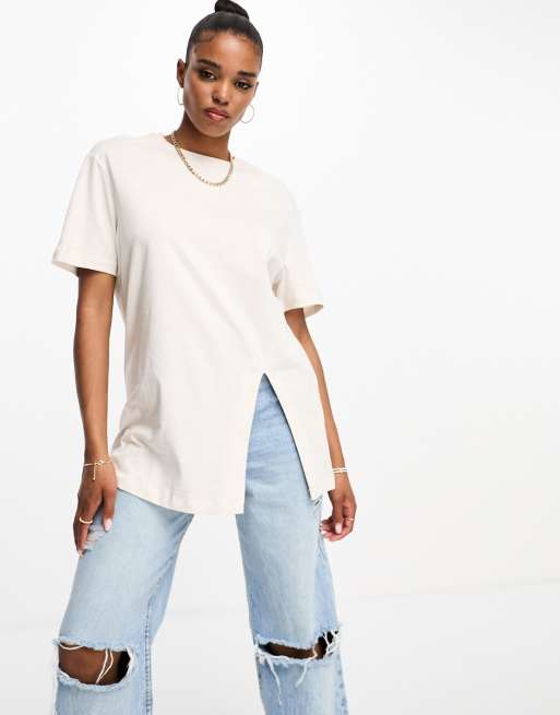 New Look Curve - T-shirt boyfriend crema con spacco sul fondo