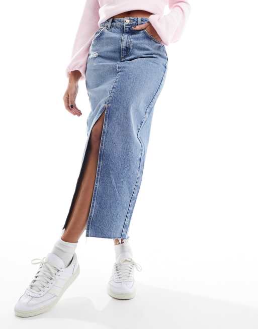 New Look - Gonna di jeans al polpaccio blu con strappi