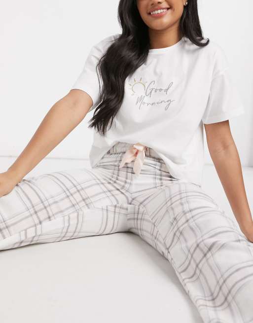 New Look - Good Morning - Pigiama con motivo rosa e pantaloni a fondo ampio a quadri