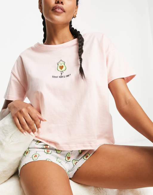 New Look - Pigiama con pantaloncini rosa con scritta e avocado