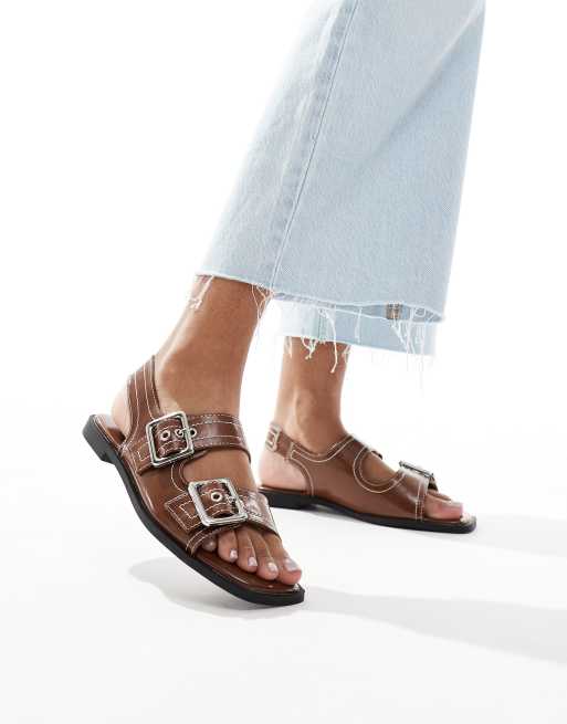 New Look - Sandali marroni verniciati con cinturino posteriore, suola spessa e cuciture a contrasto