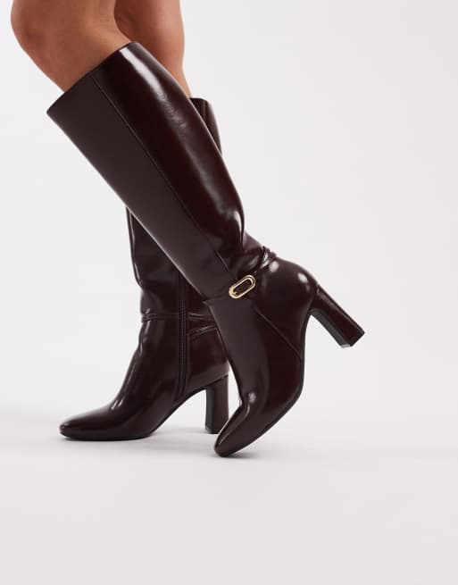 New Look - Stivali al ginocchio in pelle sintetica bordeaux con tacco largo