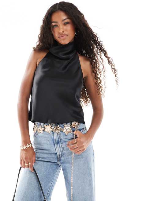 New Look - Top in raso nero allacciato al collo