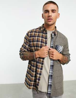 Night Addict - Camicia oversize in flanella marrone con stampa a quadri combinata