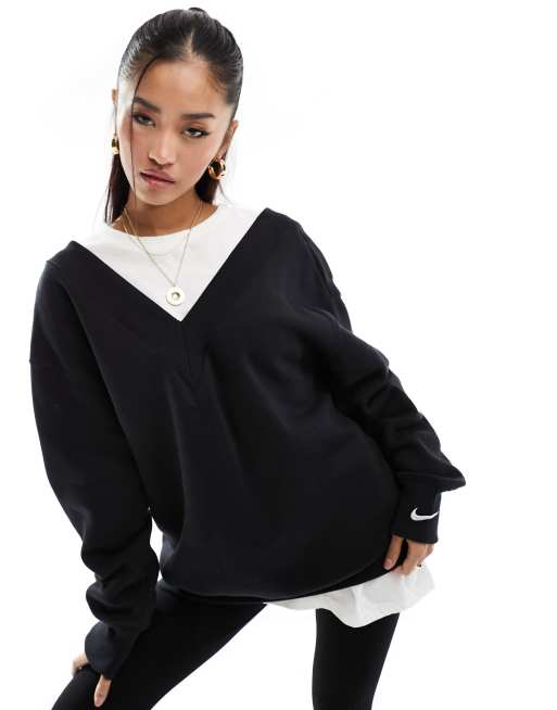 Nike - Felpa oversize in pile nero con scollo a V e logo piccolo