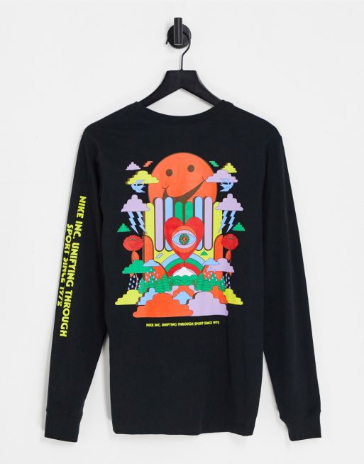 Nike - Maglietta a maniche lunghe nera con stampa a colori vivaci sul retro