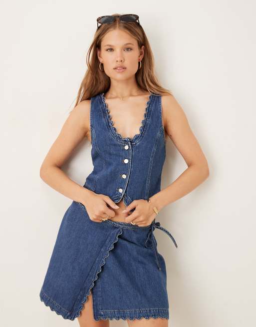 Nobody's Child - Gilet di jeans lavaggio medio con orlo smerlato in coordinato
