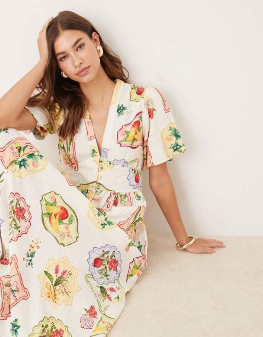 Nobody's Child - Starlight - Vestito midi con maniche a sbuffo e stampa di frutta stile cartolina