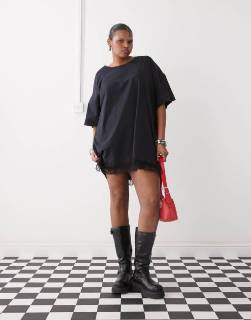 Noisy May Curve - Vestito camicia oversize nero con finiture in pizzo
