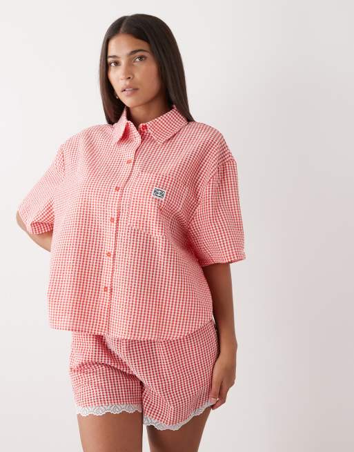 Noisy May - Camicia squadrata in seersucker rosso a quadretti in coordinato