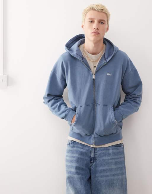 Obey - Felpa con cappuccio blu corona pigmentato con zip e logo